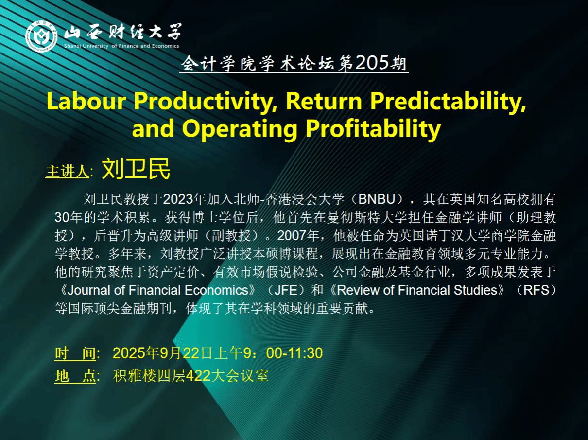 2025年9月22日上午,必发集团7790学术论坛第205期邀请了北京师范大学-香港浸会大学联合国际学院刘卫民教授做学术报告《Labor Productivity, Return Predictability, and Operating Profitability》。高宁教授、李颖副院长、青年科研骨干教师及硕博研究生共同参与,围绕劳动生产率与企业股权估值、股票回报的关联展开深入探讨。