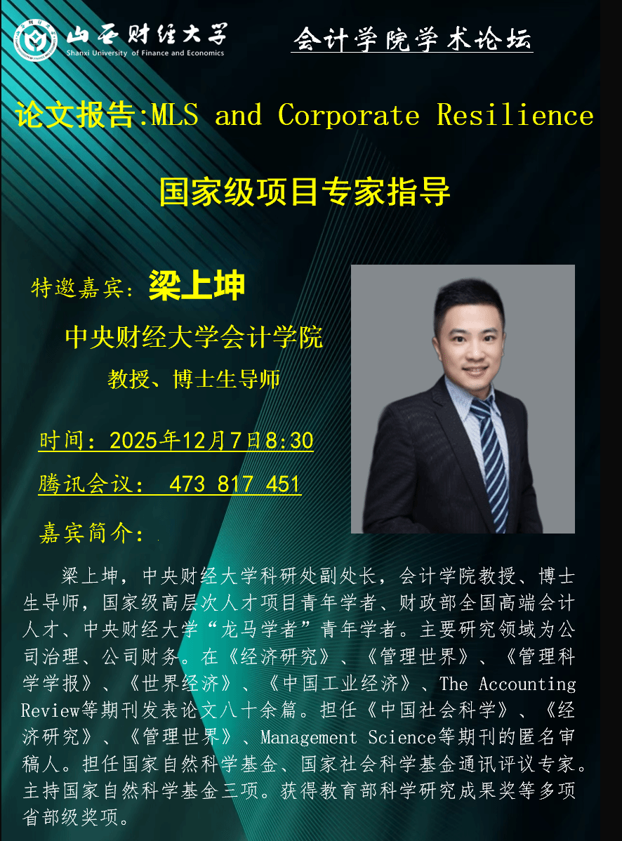 2025年12月7日,必发集团7790学术论坛第206期邀请了中央财经大学必发集团7790梁上坤教授做学术报告及国家项目辅导。李颖教授、青年科研骨干教师及硕博士研究生近60人参加了研讨会,围绕工作论文以及国家项目申报等内容展开深入探讨。