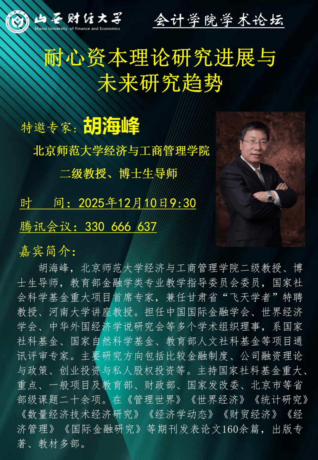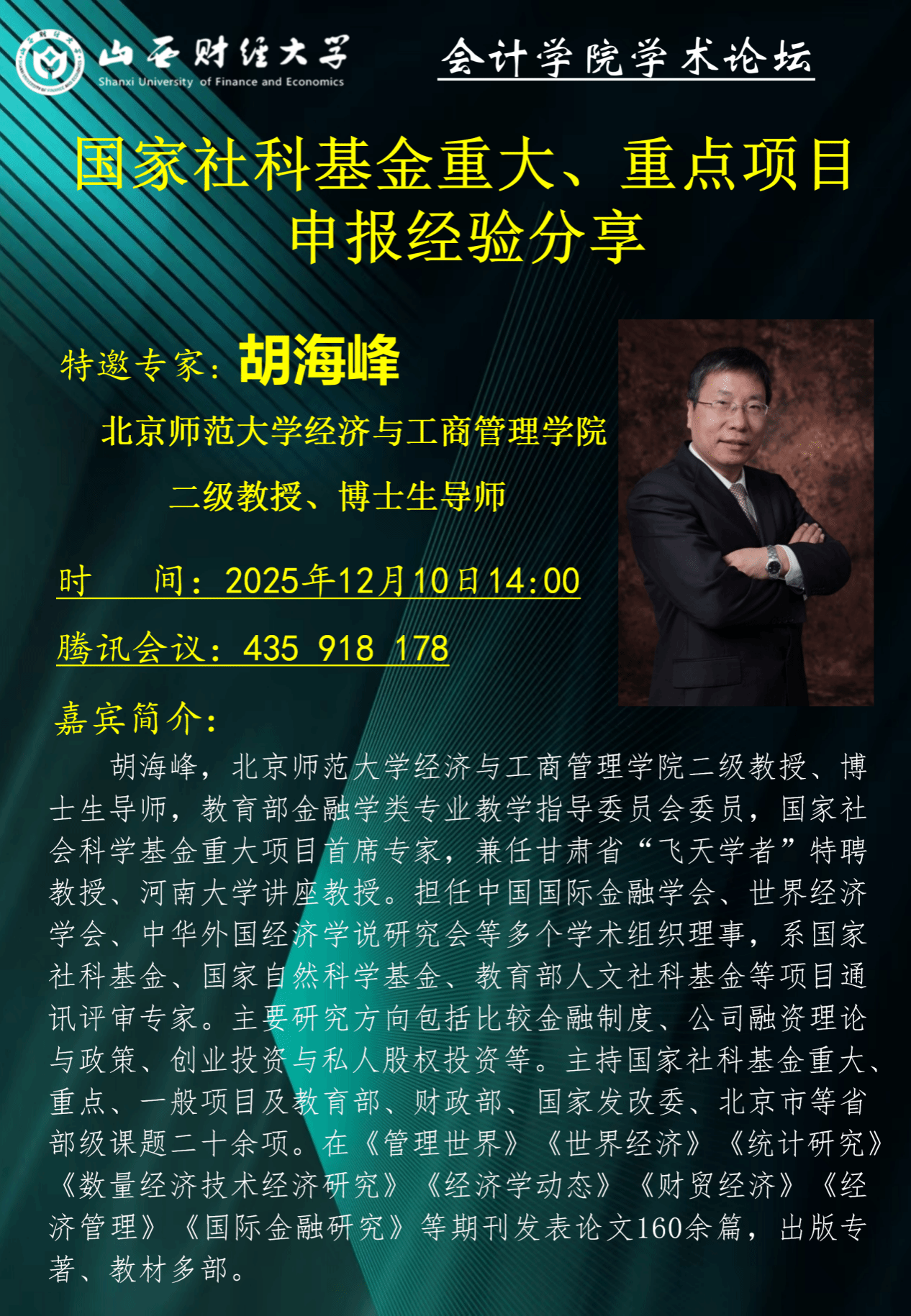 为有效提升国家级科研项目申报质量,助力青年教师精准把握选题方向与论证要领,2025年12月10日,我校成功举办国家社科基金项目申报深度指导会。会议特邀北京师范大学胡海峰教授担任指导专家,与我校青年科研骨干教师及硕博研究生进行深入交流,为参会人员带来专业细致的申报指导与经验分享。