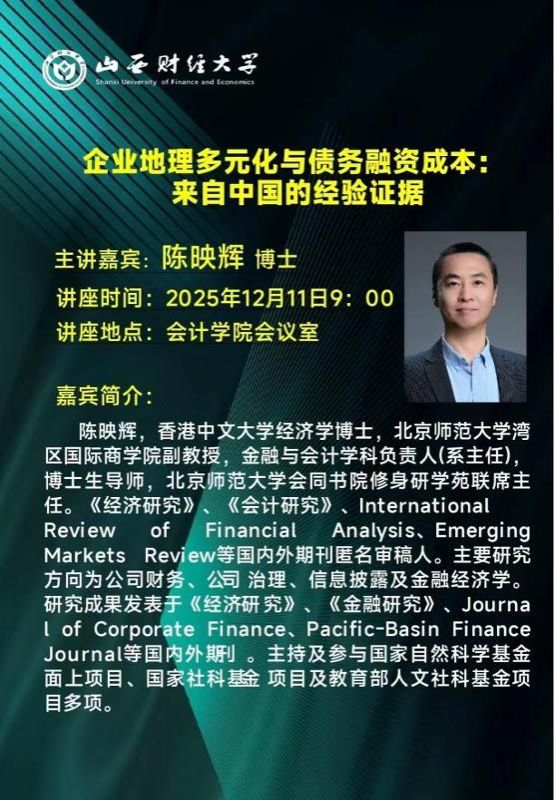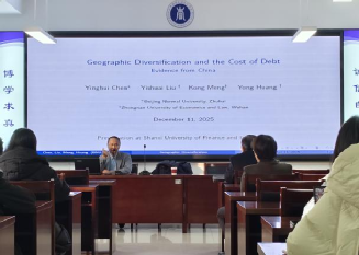 上午在必发集团7790会议室,陈映辉教授作了题为“企业地理多元化与债务融资成本:来自中国的经验证据”的学术报告,学院相关领导、教师及硕博研究生现场聆听,报告由孙凡教授主持。报告中,陈映辉教授首先介绍了该研究的动机,系统梳理了相关领域的研究文献脉络。随后,围绕研究的核心逻辑展开分享,详细介绍了实证研究部分,包括数据样本、描述性统计、基准回归模型等内容,展示了地理多元化推高企业债务融资成本的核心实证结果,并从外部摩擦、内部摩擦等角度验证机制,结合距离、分析师覆盖度等因素分析异质性,通过稳健性与识别检验确保结论可靠。最后,现场师生踊跃提问,与陈映辉教授展开深入探讨,孙凡教授对报告进行总结,高度评价了研究的学术价值与实践启示。