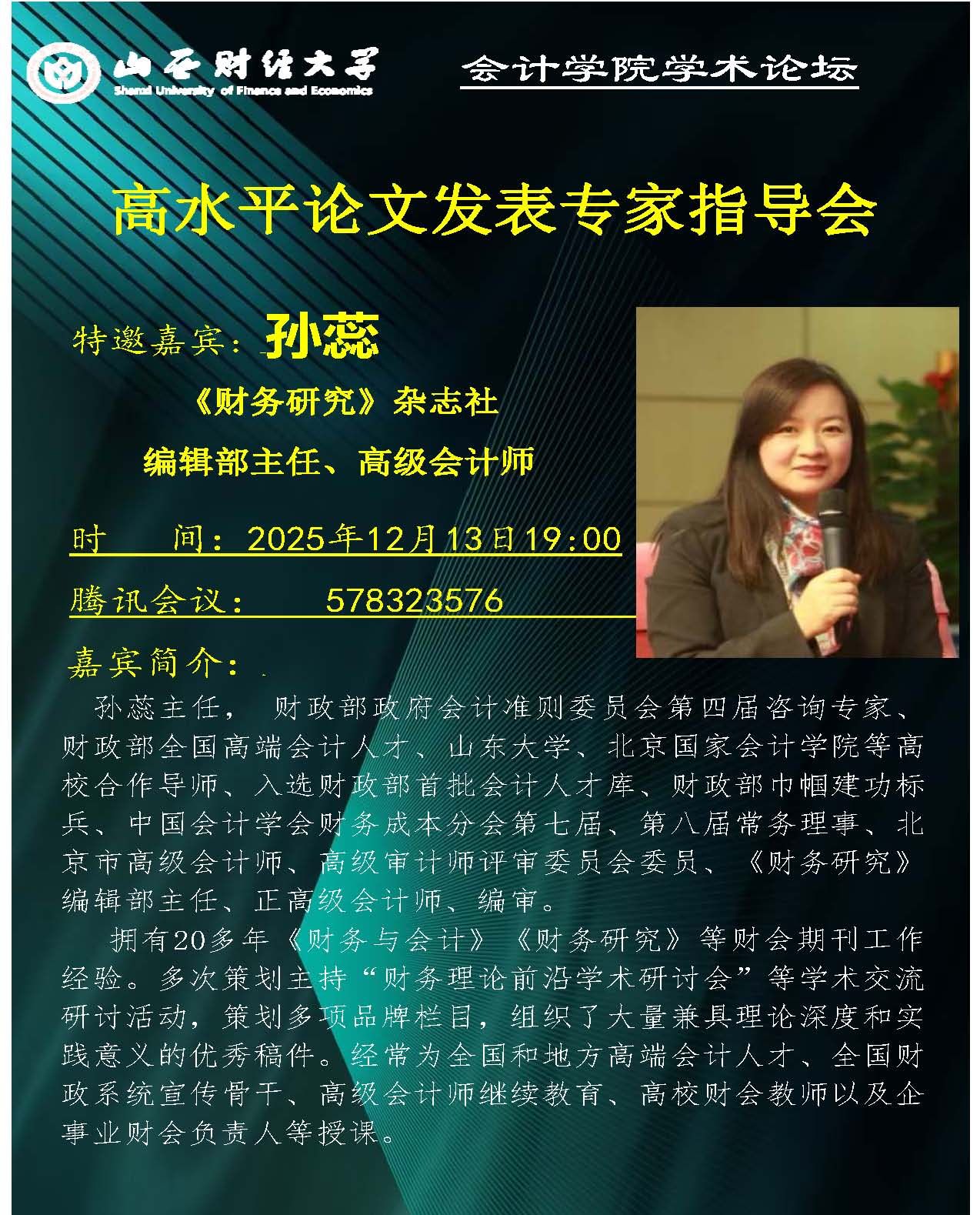 2025年12月13日晚19:00,必发集团7790学术论坛第216期在线上如期举行。本期论坛特邀《财务研究》编辑部孙蕊主任担任主讲嘉宾,为学院师生带来一场题为“高水平论文发表专家指导会”的学术报告。论坛由我院王晓亮教授主持,学院青年科研骨干教师及硕博研究生共计50余人齐聚一堂,围绕这一主题展开了深入的学习与交流。