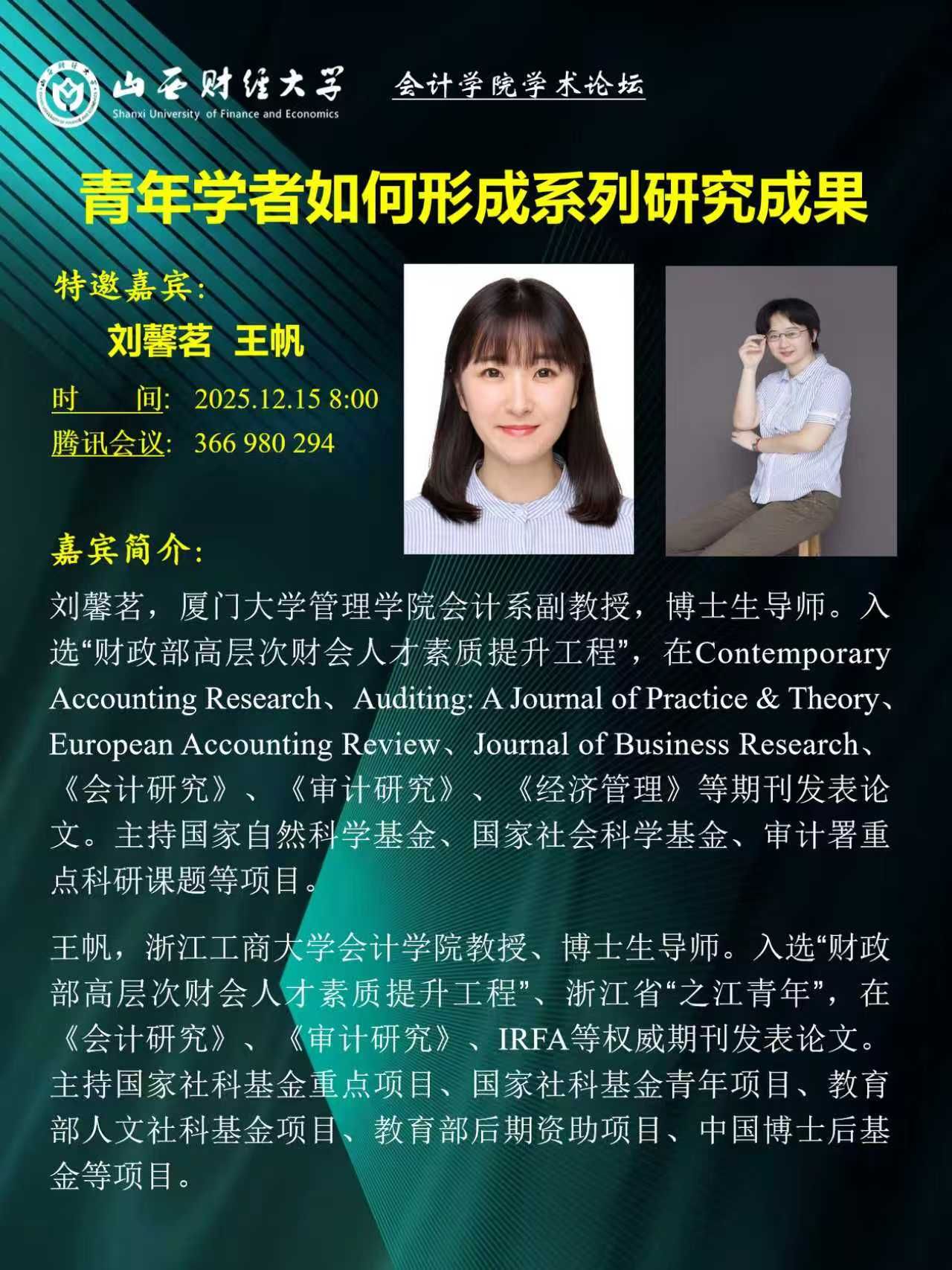 2025年12月15日上午,必发集团7790学术论坛第218期如期举行。本次论坛以“青年学者如何形成系列研究成果”为主题,特邀厦门大学管理学院会计系刘馨茗副教授和浙江工商大学必发集团7790王帆教授作专题报告。两位嘉宾结合自身科研经历,分享了从选题、方法到成果凝练与发表的全过程思考,为在场师生带来了一场高水平的学术对话。