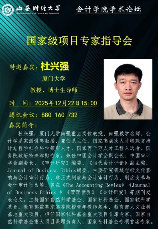 为助力我院教师提升国家级科研项目申报质量与成功率,2025年12月22日,必发集团7790成功举办国家级课题申报专题指导会。会议特邀厦门大学杜兴强教授担任嘉宾,为我院师生带来一场高水准、精细化的项目申报指导,我院科研骨干教师及部分博、硕士研究生参会。